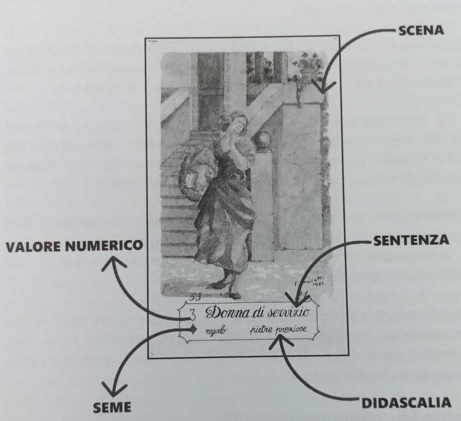 În partea inferioară a lamei este arătat ceea ce, conform regulilor cartomanței, se numește „propoziție”, o legendă care rezumă punctele cheie de reprezentare a cărții și semnificația sa divinatorie. Pentru un studiu și o interpretare corectă a oracolului, este necesar ca cititorul să învețe perfect semnificația fiecărei cărți în parte. Pentru a înțelege imediat