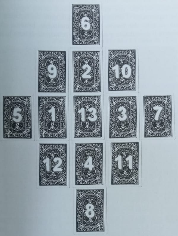Se efectuează operațiunile obișnuite de amestecare, tăiere și extragere a cărților. Ghicitoarea aranjează cărțile extrase de consultant conform schemei ilustrate